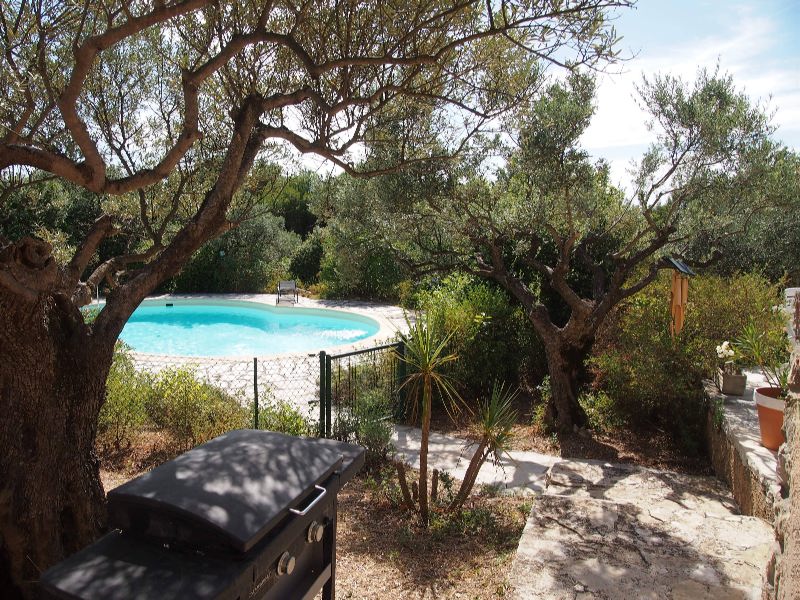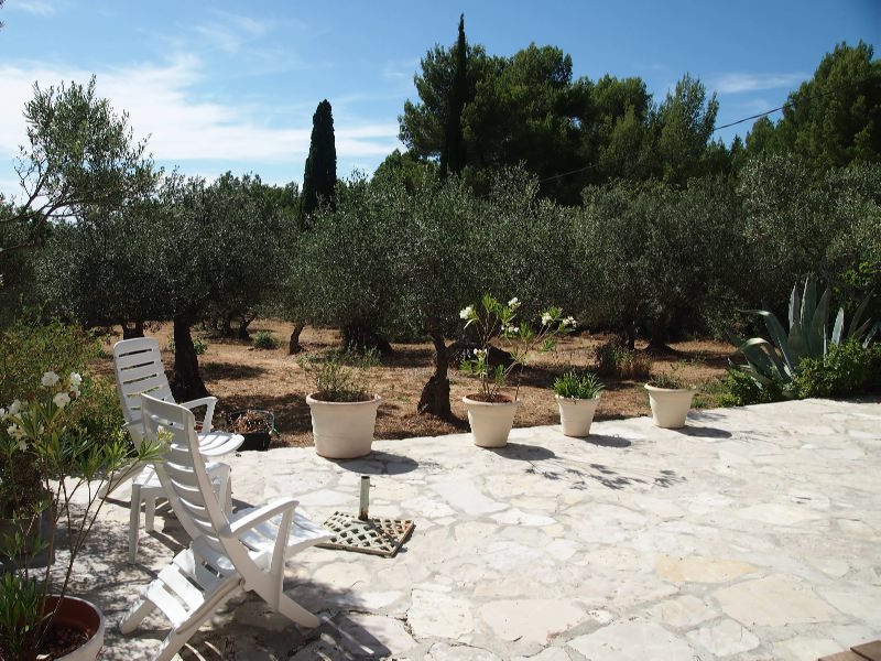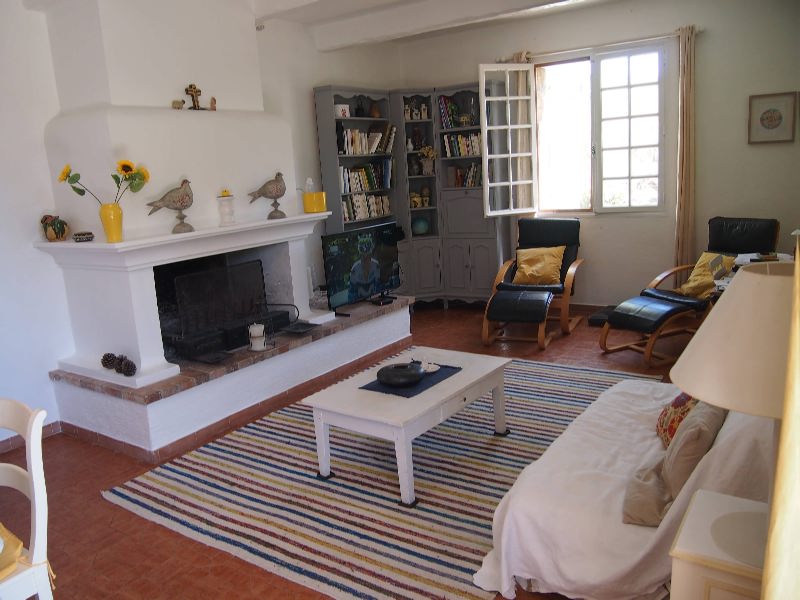 De royale woonkamer beschikt over een comfortabele zithoek en grote openslaande deuren die uitkomen op het terras. Vanaf hier heeft u een schitterend uitzicht over de olijfgaard die zich rondom het huis uitstrekt. Via enkele traptreden bereikt u de tuin en het omheinde zwembad, veilig voor kinderen. Het volledige terrein is omheind, zodat ook uw hond zorgeloos kan meegenieten.