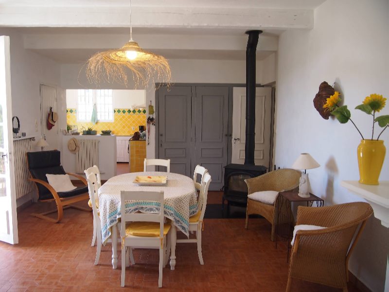 De ruime, lichte keuken is een echte blikvanger met authentieke handgemaakte tegels uit Salernes en veel natuurlijk licht. Aangrenzend bevindt zich een praktische bijkeuken met koelkast, extra bergruimte en voorzieningen zoals een strijkplank en strijkijzer.