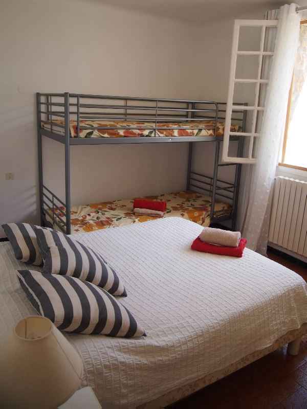 Via de hal bereikt u de slaapkamers en badkamer. De eerste slaapkamer is voorzien van een comfortabel tweepersoonsbed en ruime kasten. De badkamer, eveneens afgewerkt met Salernes-tegels, beschikt over een douche, dubbele wastafel en toilet. Aan het einde van de gang bevindt zich de tweede slaapkamer met een tweepersoonsbed en een stapelbed. Indien gewenst kan ook de slaapbank in de woonkamer als extra bed worden gebruikt.